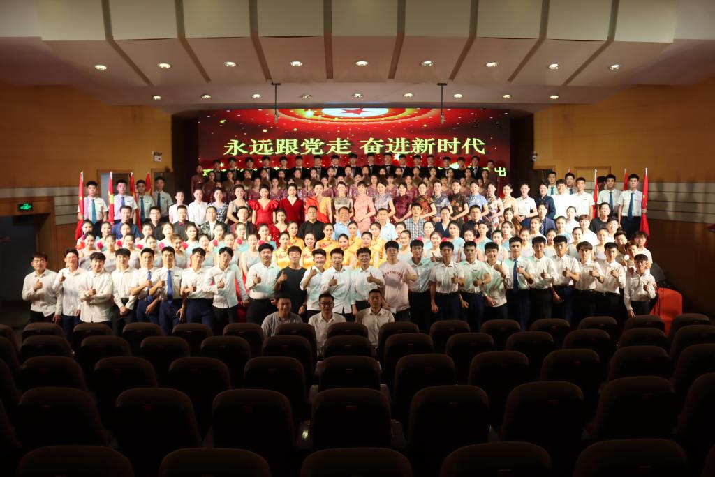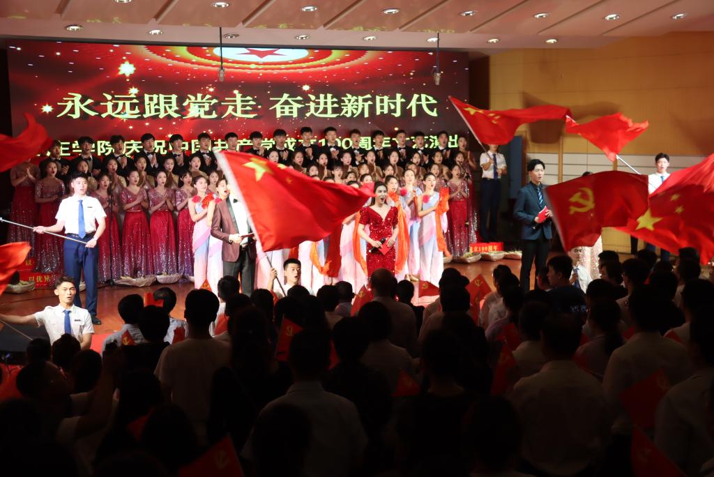现场,歌声、掌声如潮。师生们的歌声或旋律激昂、气势澎湃,或婉转悠扬、韵味典雅,辅以绚丽多彩的服装和舞台设计,融合优美的舞蹈表演为观众奉上了一场精彩的视听盛宴。嘹亮的歌声回荡在上空,台上演员们深情放歌,台下观众也情不自禁地跟着一起唱和。演出最后,雄壮激昂的音乐再次响起,全体人员一起挥舞手中的党旗,学校领导走上舞台,带领现场师生齐声高唱《没有共产党就没有新中国》,用歌声抒发着对党的感恩之情和庆祝建党百年华诞的喜悦之情,也唱出了担当新使命、奋进新时代的最强音。