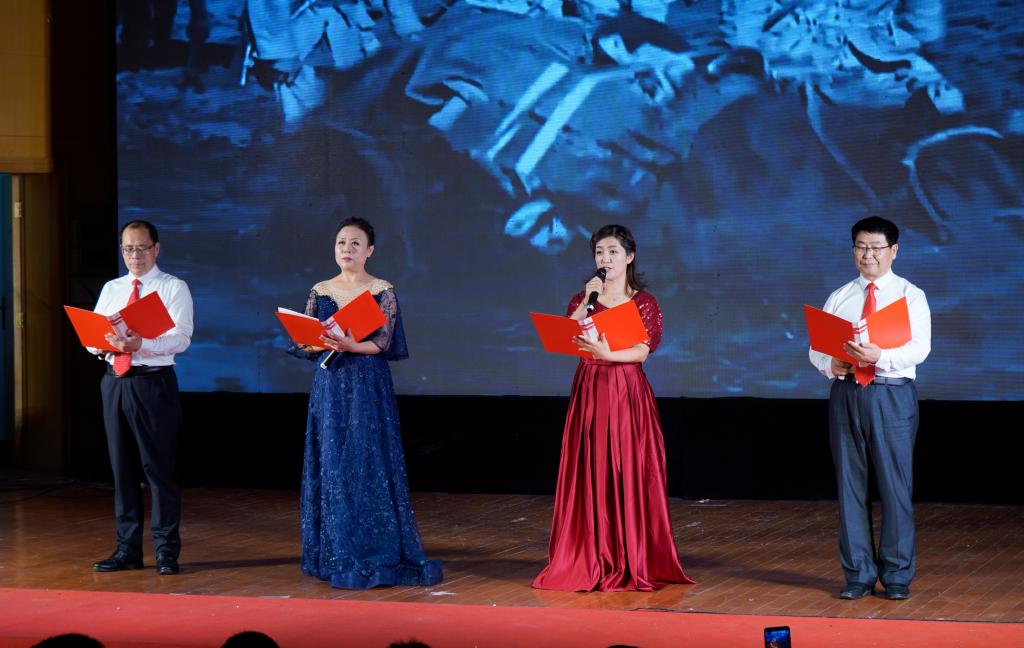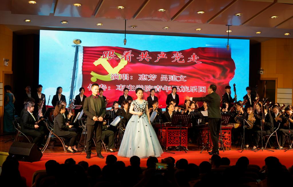 音乐厅灯光璀璨,洋溢着浓浓的喜庆氛围。演出在枣院师生《唱支山歌给党听》MV的经典旋律中拉开帷幕。随后,一首首动人的红歌、一段段深情的朗诵,或慷慨激昂,或娓娓动听,在满怀深情中表达出对我们党光辉历史的真情歌颂。