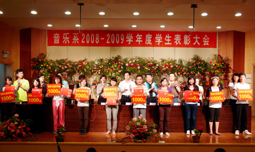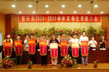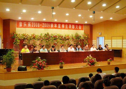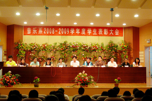 6月8日晚6时,音乐系在音乐厅举行2008-2009学生表彰大会,音乐系党、政领导及各教研室主任出席了此次大会,音乐系受表彰的同学及08级学生共250余人参加了表彰大会。