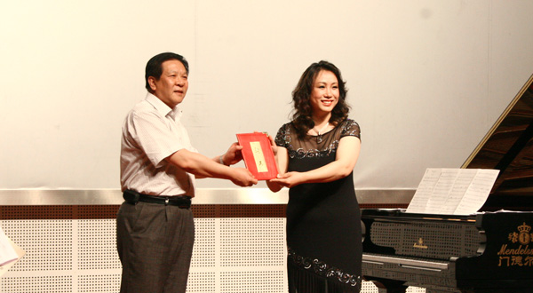 音乐会中场,校长胡小林为李秀英老师颁发特聘教授荣誉证书。