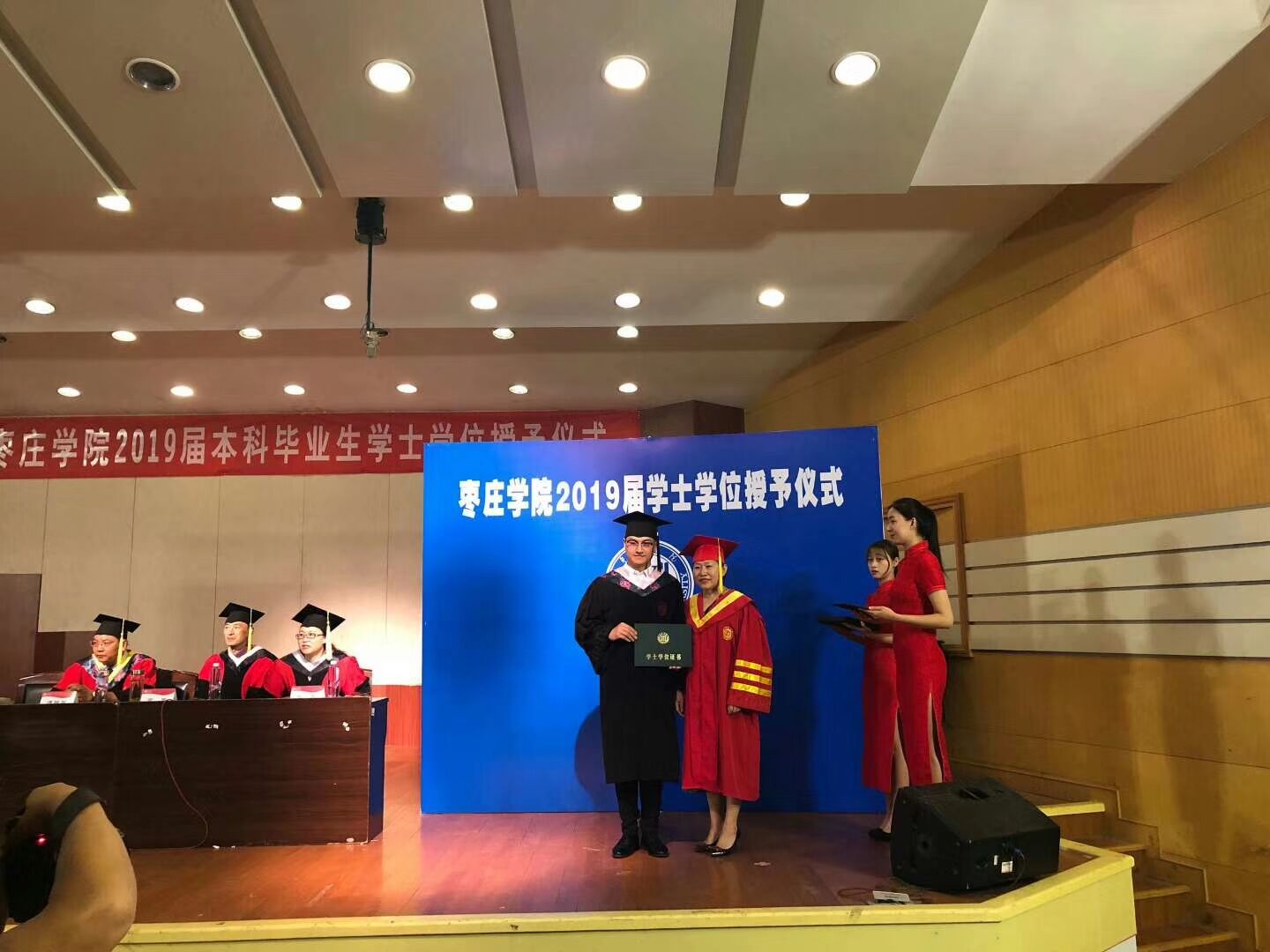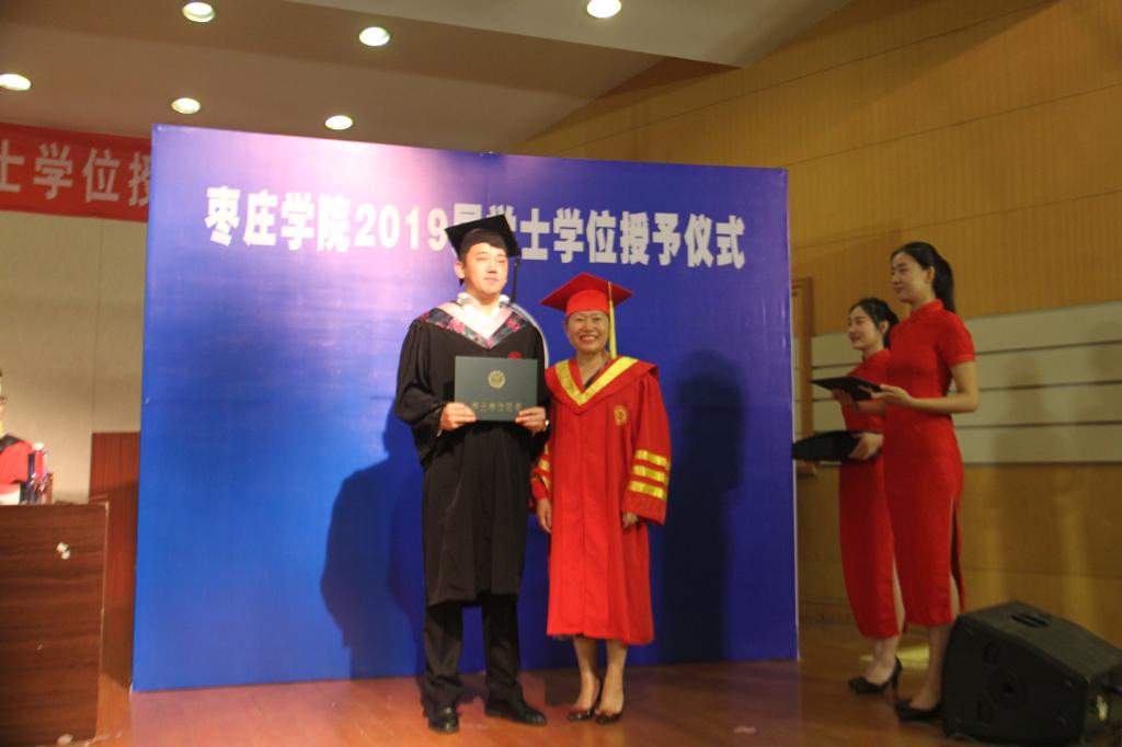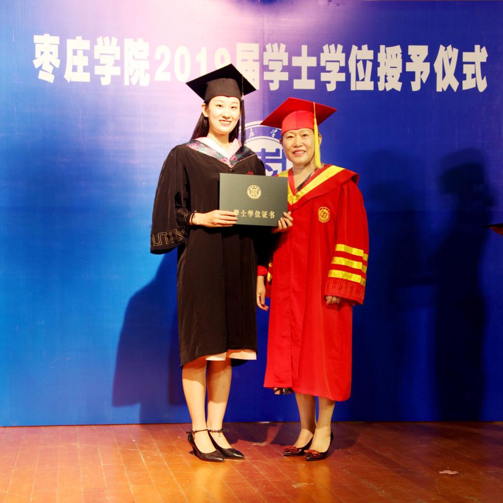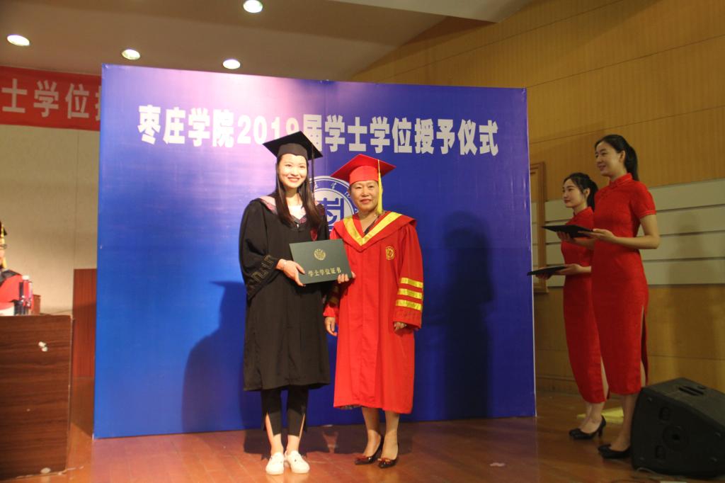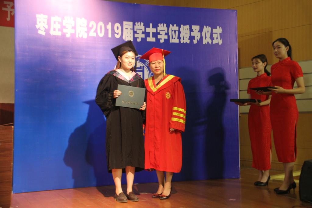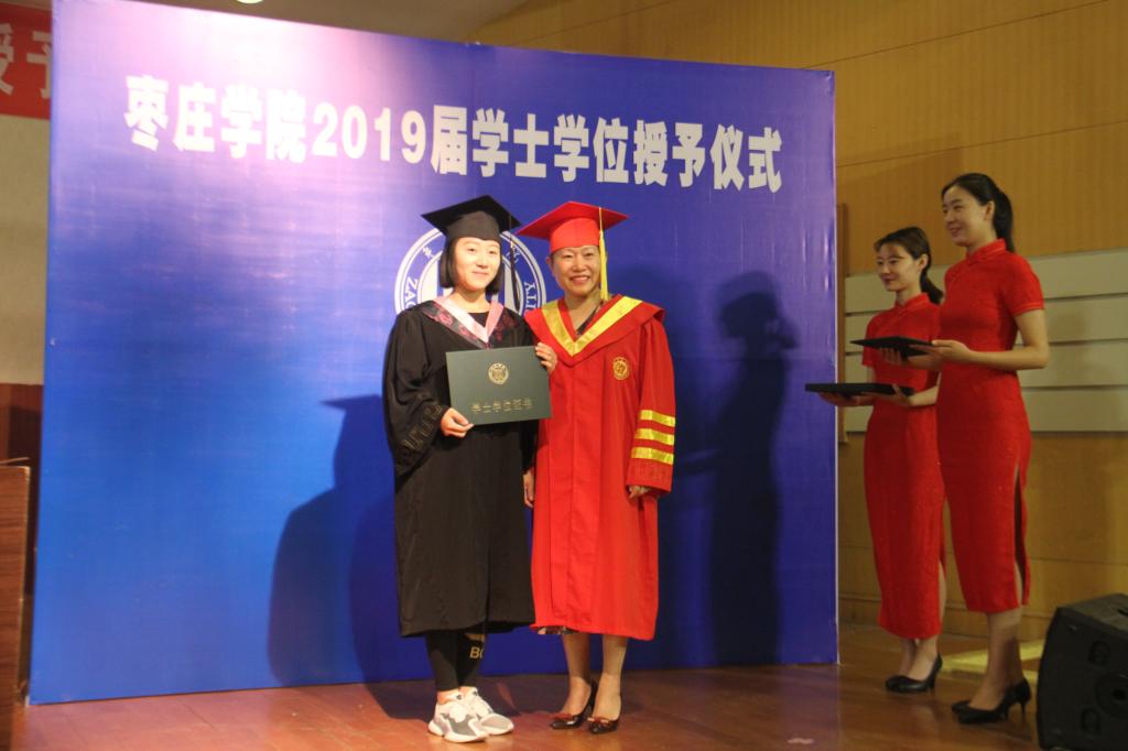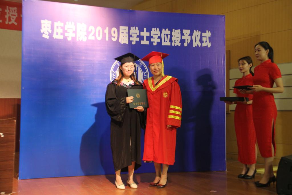伴随着欢快的乐曲,毕业生身穿学士服,依次走向主席台,深情地鞠躬。李丽清教授亲切地与2019级每一位获得学士学位的同学握手,为他们扶苏、拨穗、正冠,颁发毕业证书并合影留念。