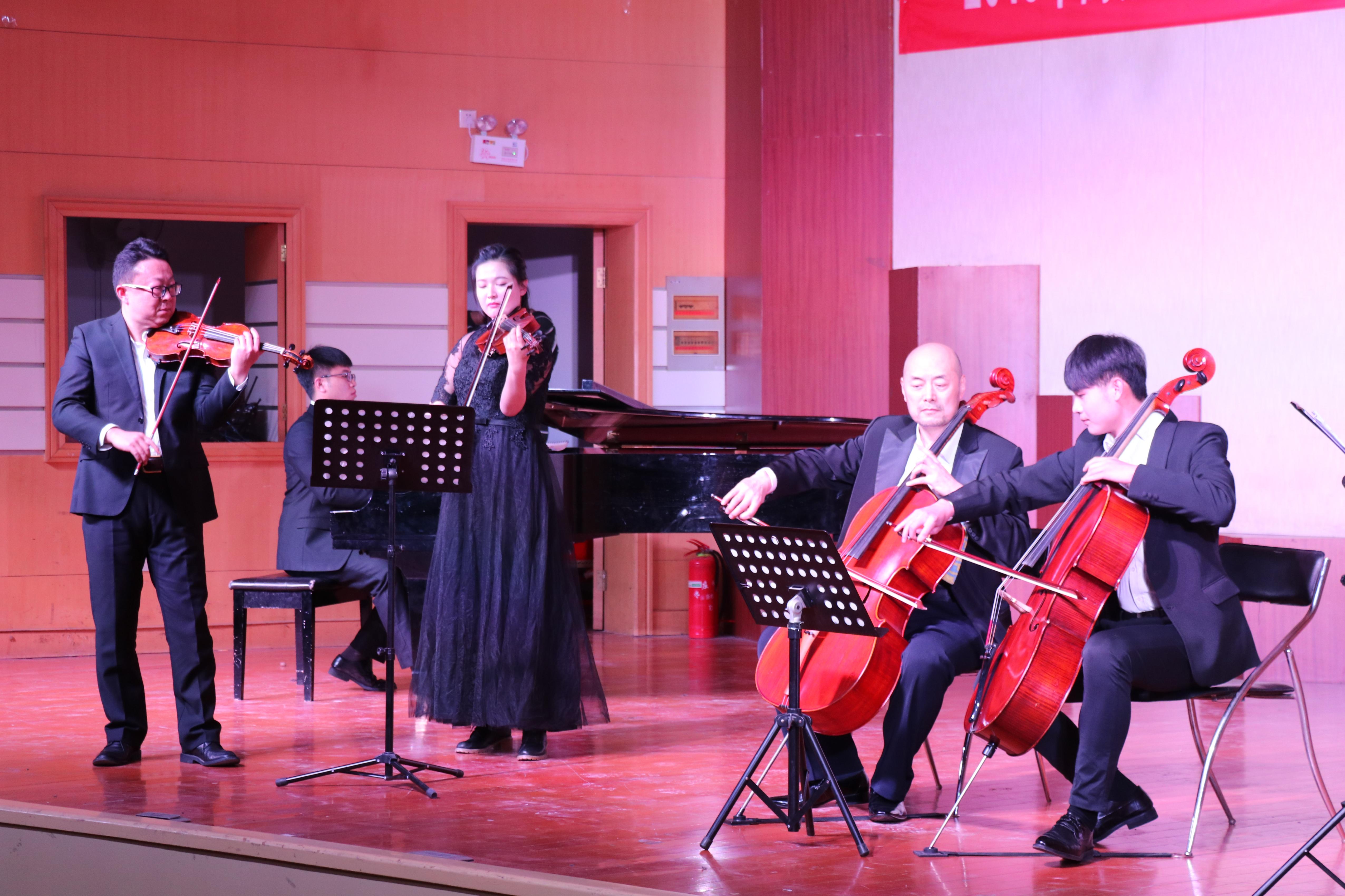 群舞《桃李不言》伴随着一段优美的旋律首先拉开本场演出序幕,坎坷的山路、鲜艳的红领巾以及老师佝偻的背影,他们以优美灵动的舞姿为我们展现了感怀师恩的真情,彰显了对尊师风尚的弘扬;电声乐队带来的两首流行歌曲《我的秘密》、《哎,妈妈》带动全场气氛,架子鼓的敲击声强劲有力,将本场演出推向高潮;一首《庆余年》在民乐团各位老师手下成为森林里欢快舞动的精灵,肆意的旋转跳跃,给我们带来一幅活泼欢快的图景;三位老师带来的钢琴三重奏德沃夏克《e小调钢琴三重奏比卡姆》第六乐章op.90的旋律缓缓升起,音乐风格细腻优雅,将钢琴、小提琴和大提琴完美结合,富有极强的艺术感染力。本场演出既有辉煌优雅的西方音乐又有诗情画意的东方之音,中西结合的音乐盛宴满足了观众的视听享受。演出最后伴随着弦乐合奏《我的祖国》落下帷幕,全场掌声雷动,反响热烈。