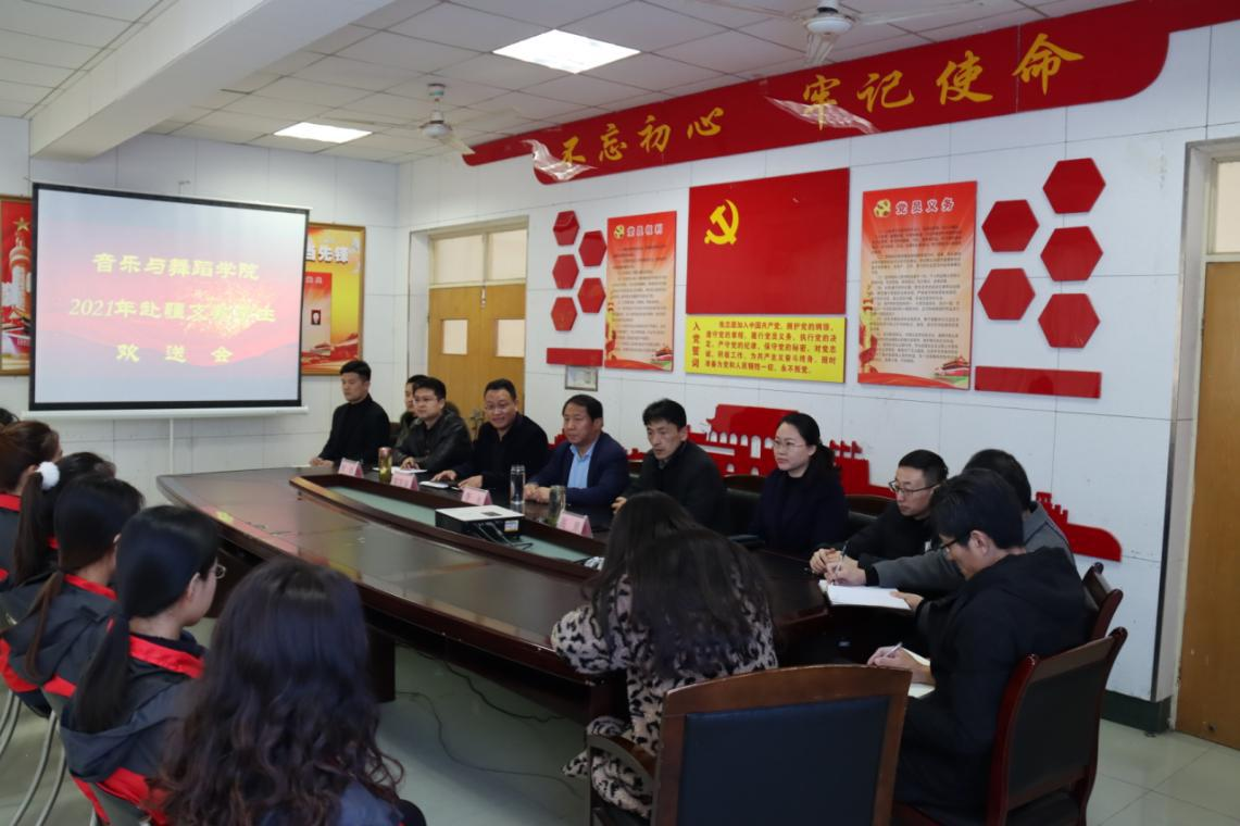 新学期,新梦想,新征程,新跨越!3 月 4 日上午,pg游戏电子模拟器2021年援疆支教学生欢送会在3002会议室隆重举行。院长李永、党总支书记高原、副院长郑发奋、党总支副书记华莹、院长助理贾波、院办负责人黄庆鹏、援疆支教负责人王升典、辅导员老师以及援疆支教团全体同学参加了欢送会,副院长郑发奋主持会议。
